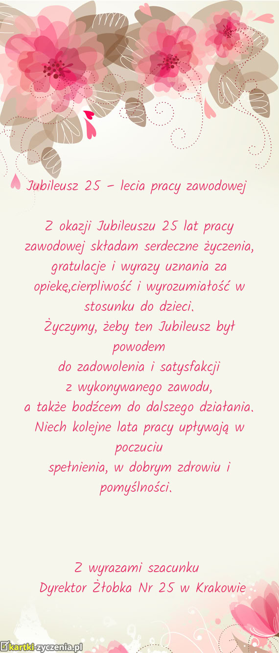 Z okazji Jubileuszu 25 lat pracy zawodowej składam serdeczne życzenia, gratulacje i wyrazy uznania za opiekę,cierpliwość i wyrozumiałość w stosunku do dzieci.
