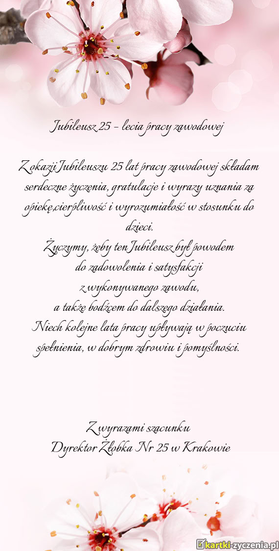 Z okazji Jubileuszu 25 lat pracy zawodowej składam serdeczne życzenia, gratulacje i wyrazy uznania za opiekę,cierpliwość i wyrozumiałość w stosunku do dzieci.