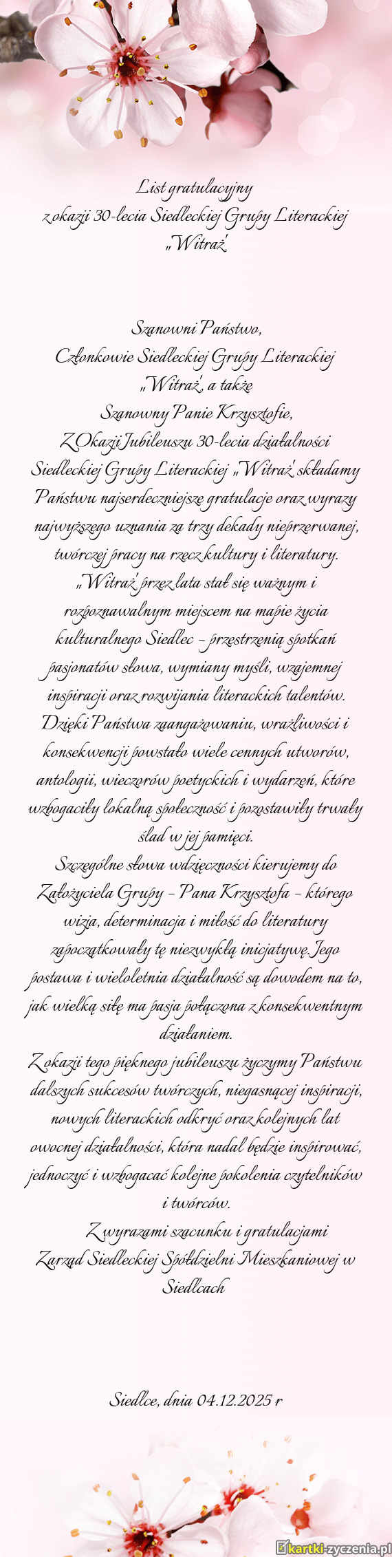 Z okazji 30-lecia Siedleckiej Grupy Literackiej „Witraż”