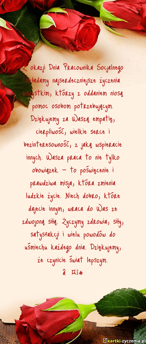 Z okazji Dnia Pracownika Socjalnego składamy najserdeczniejsze życzenia wszystkim, którzy z oddaniem niosą pomoc osobom potrzebującym. Dziękujemy za Waszą empatię, cierpliwość, wielkie serce i bezinteresowność, z jaką wspieracie innych. Wasza praca to nie tylko obowiązek — to poświęcenie i prawdziwa misja, która zmienia ludzkie życie. Niech dobro, które dajecie innym, wraca do Was ze zdwojoną siłą. Życzymy zdrowia, siły, satysfakcji i wielu powodów do uśmiechu każdego dnia. Dziękujemy, że czynicie świat lepszym. ❤️